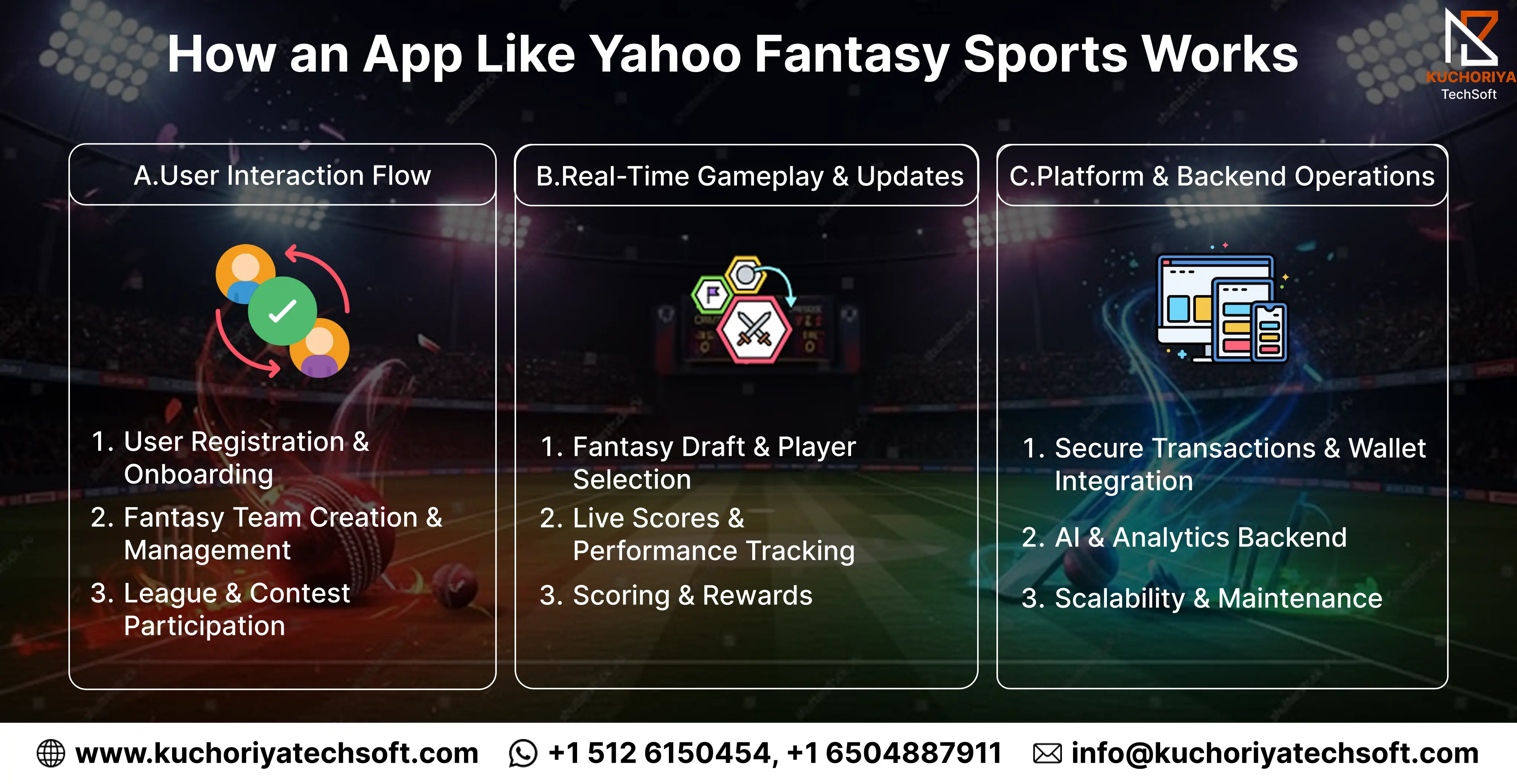 Building a fantasy sports app like Yahoo Fantasy Sports requires a clear understanding of its operations, user flow, and real-time engagement mechanisms. Kuchoriya TechSoft ensures your apps, like Yahoo Fantasy Sports, deliver seamless gameplay, predictive insights, and maximum user retention.