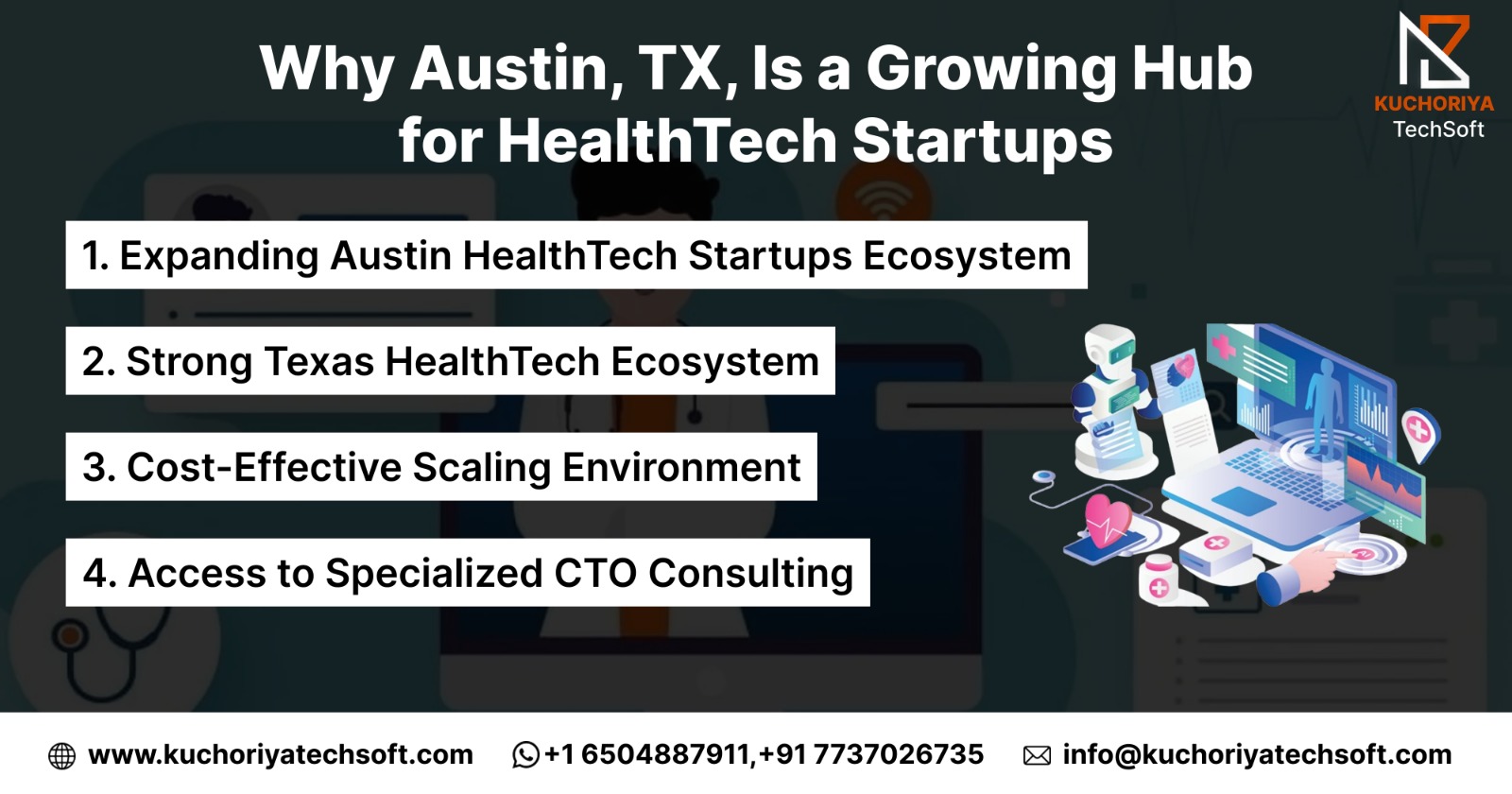 This is where Kuchoriya TechSoft helps fast-growing healthtech startups bridge the gap between early-stage innovation and enterprise readiness. By offering virtual CTO services, fractional CTO services, and CTO as a service, startups gain strategic direction, scalability planning, and compliance-focused execution—without the high cost of full-time executives, especially in a growing hub like Austin, Texas