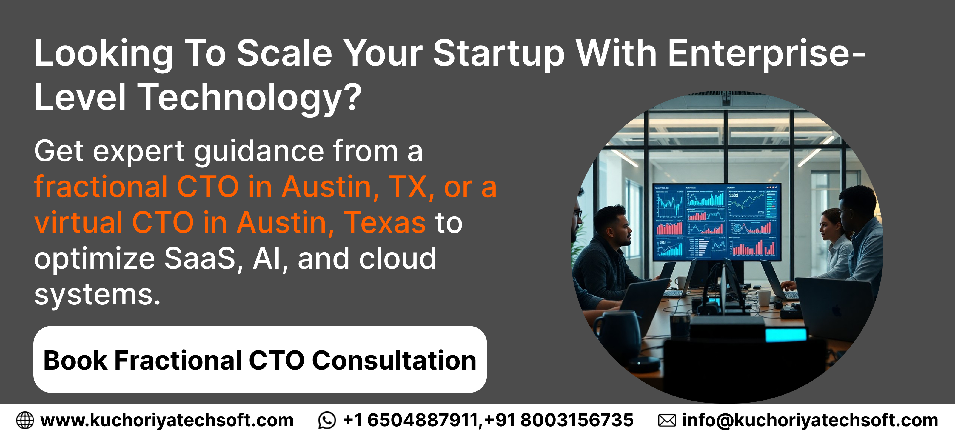 At Kuchoriya Techsoft, we help Austin startups transform their technology from day one. Our fractional CTO, Austin, TX, and virtual CTO Austin Texas, services provide strategic guidance, enterprise-grade architecture, and scalable cloud solutions without the cost of a full-time CTO.