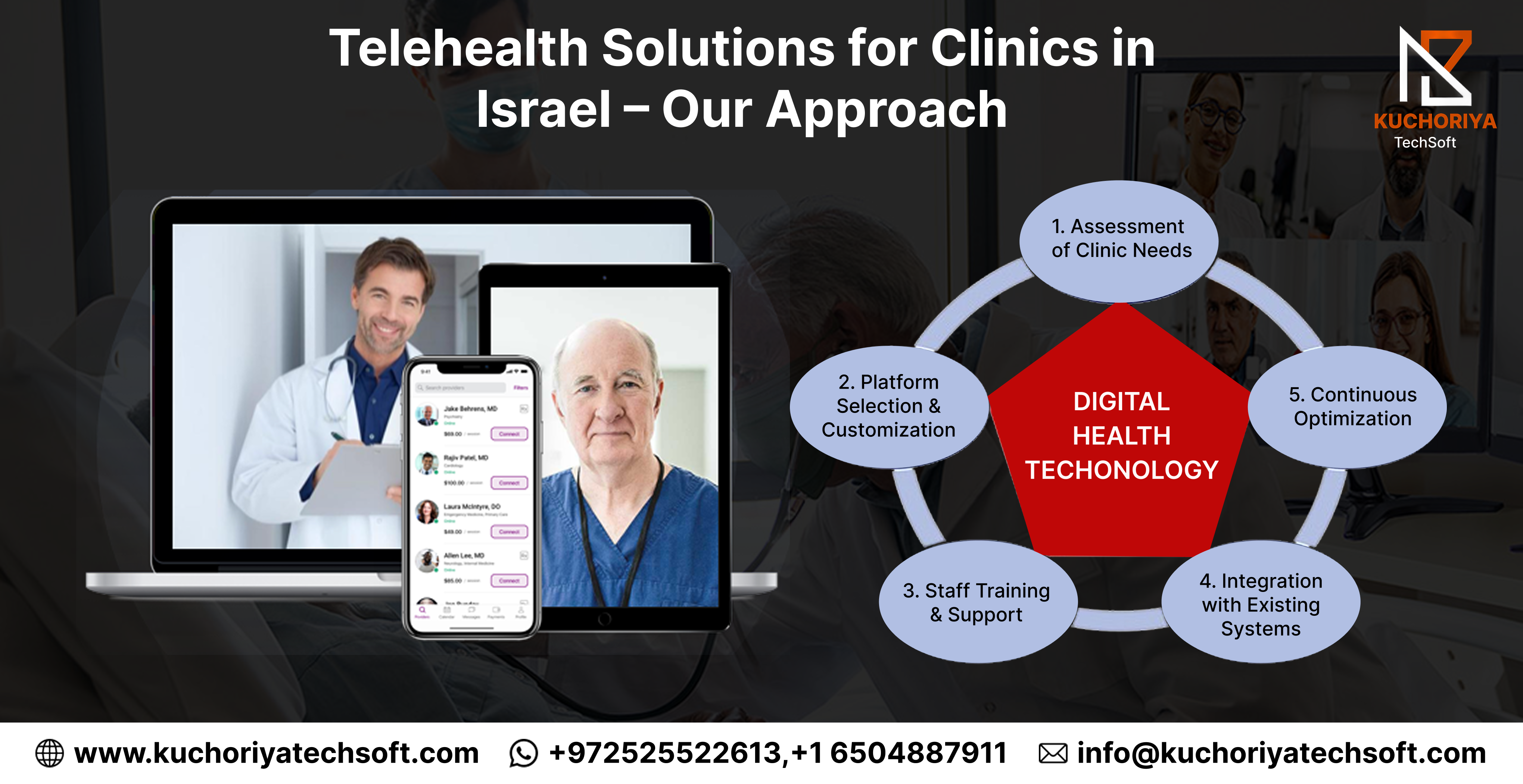 Delivering effective telehealth in Israel requires a structured approach tailored to each clinic’s needs. Kuchoriya TechSoft provides telehealth solutions for clinics in Israel that are scalable, secure, and designed to improve patient care and operational efficiency.