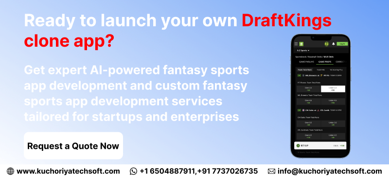 At Kuchoriya Techsoft, we deliver fantasy sports app development solutions that cater to both startups and enterprises. Our expertise combines cutting-edge technology, AI integration in DraftKings clone, and robust backend architecture to build secure, engaging, and feature-rich applications. Through virtual CTO solutions for enterprises, we provide strategic guidance to help businesses navigate technical challenges, optimize development costs, and create platforms that not only attract and retain users but also maximize revenue potential. With these strategies, companies can leverage the current growth trends to establish a strong foothold in the competitive fantasy sports market of 2025.