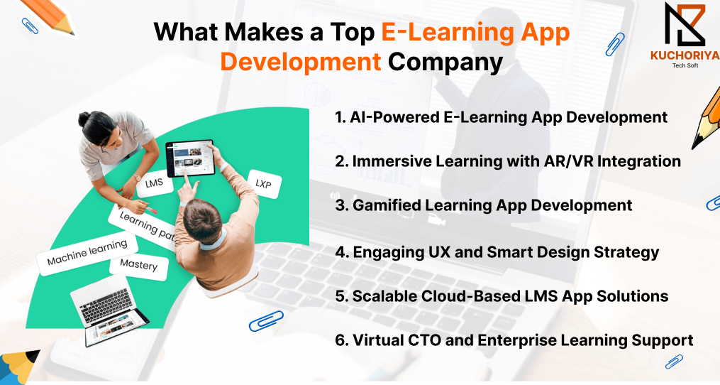 At Kuchoriya TechSoft, we combine creativity, cutting-edge technology, and strategic expertise to deliver custom e-learning app development services that engage learners and scale businesses. From AI-powered LMS solutions to gamified learning experiences and virtual CTO consulting, we bring ideas to life with precision and passion.
